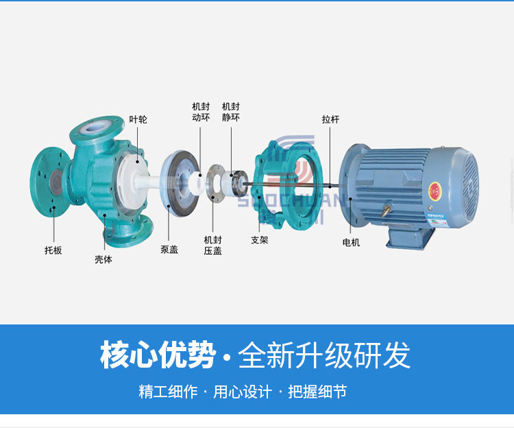 3、軸封采用先進的外裝式波紋管機械密封靜,環選用氧化鋁陶瓷,動環采用四氟填充材料(根據用戶特殊工況專配其他材質),耐磨耐腐,密封性好,有效的增長了機械密封的使用壽命;