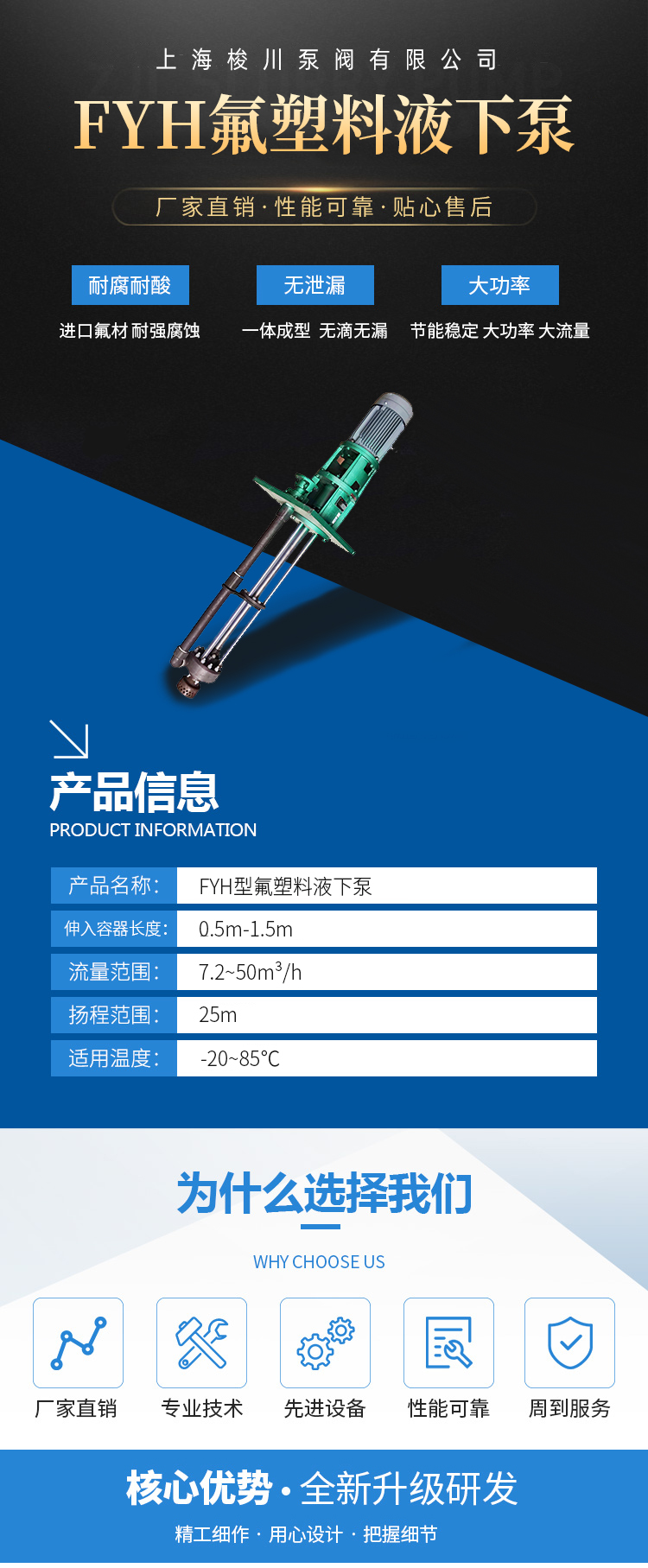 FYH型氟塑料液下泵是長軸立式離心泵,其接觸液體部分全部由氟塑料壓制而成,具有耐腐蝕范圍廣、效率高、重量輕、不需要灌液即能抽送、維修方便等特點。