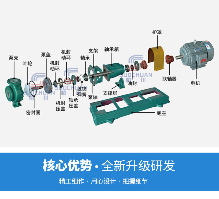泵體和泵蓋均采用金屬(HT200)基體內襯氟塑料,葉輪采用金屬嵌件(WCB)外包氟塑料合金壓制成型。優點:耐腐蝕性范圍廣,強度高,經久耐用。