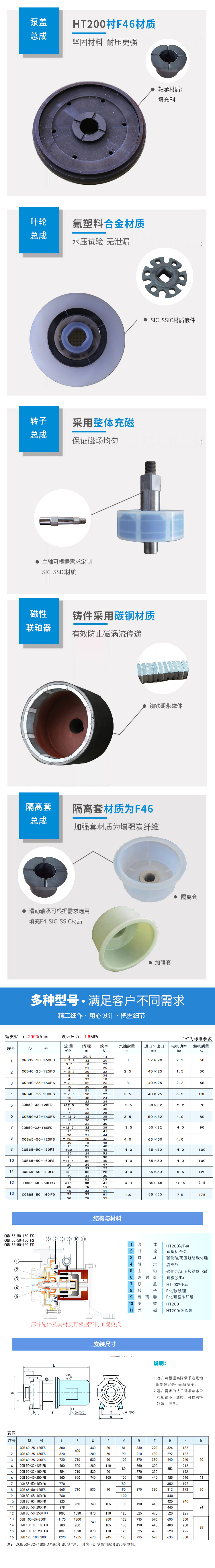 用途 本產品廣泛適用于:石油化工、制酸制堿有色金屬冾煉、汽車制造的酸洗工藝、稀土分離、農藥、染料、醫藥、造紙、電鍍、無線電等行業。適用溫度:-20℃C~100℃。 設計特點 防漏設計取消了軸封,利用磁力耦合間接驅動,完全消除了滴漏的煩惱,絕不污染場地。由于泵的過流部分選用“氟塑料合金”制造。可連續輸送任意濃度的酸、堿、強氧化劑等腐蝕介質而毫不受損。 工作原理 驅動裝置采用主動磁性聯軸器直接裝在電機軸上,泵腔完全封閉,通過磁力耦合間接驅動泵軸上帶磁鋼的葉輪旋轉,結構緊湊、安全節能。 堅固耐用的泵體 結構雖然接觸液體部分是氟塑料,但泵體基體是金屬材料,故泵體可以承受部分管道的重量及機械性沖擊,堅固耐用。