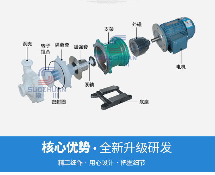 防漏設計取消了軸封,利用磁力耦合間接驅動,有效消除了滴漏的煩惱,絕不污染場地。由于泵的過流部分選用“氟塑料合金”制造。可連續輸送任意濃度的酸、堿、強氧化劑等腐蝕介質而毫不受損。