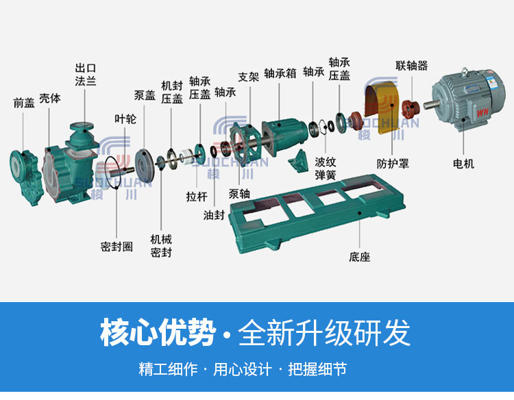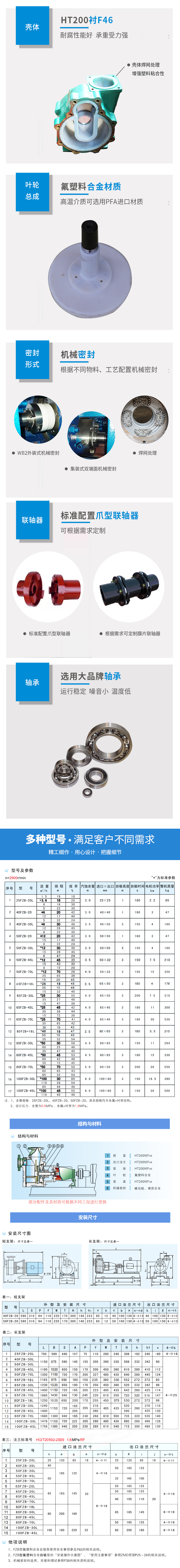 過流部件采用氟塑料、氟塑料合金制造,耐腐蝕性能優(yōu)異。基體采用金屬材料制造,耐壓能力強。