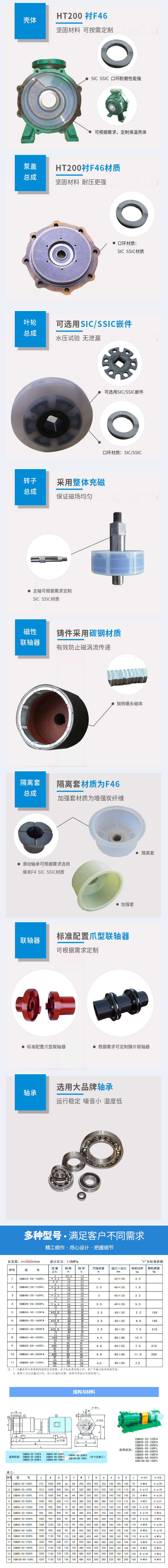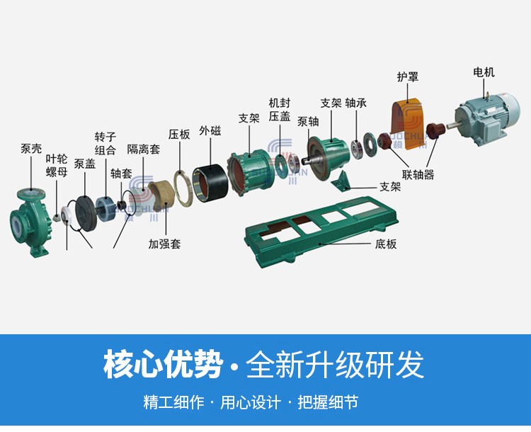 防漏設(shè)計(jì)取消了軸封,利用磁力耦合間接驅(qū)動(dòng),有效消除了滴漏的煩惱,絕不污染場地。由于泵的過流部分選用“氟塑料合金”制造。可連續(xù)輸送任意濃度的酸、堿、強(qiáng)氧化劑等腐蝕介質(zhì)而毫不受損。