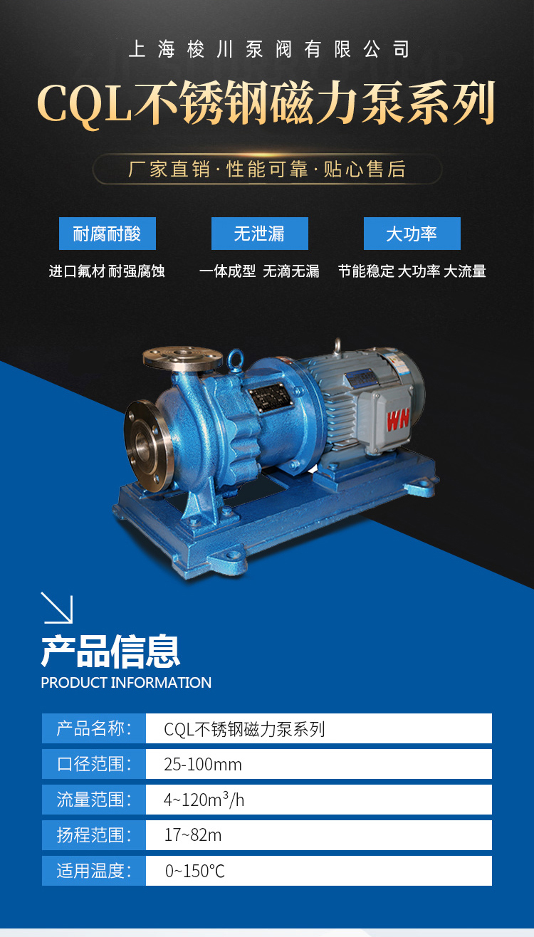 CQL型磁力驅動泵(簡稱磁力泵)是將永磁聯軸器的工作原理應用于離心泵的新產品,設計合理,工藝先進、具有全密封、無泄漏、耐腐蝕等特點,其性能達到國外同類產品的先進水平。產品用途磁力泵結構緊湊、外形美觀、體積小、噪音低、運行可靠、使用維修方便。可廣泛應用于化工、制藥、石油、電鍍、食品、電影照相洗印、科研機構、工業等單位抽送酸、堿液、油類、稀有貴重液、毒液、揮發性液體,以及循環水設備配套、過濾機配套。特別是漏、易燃、易爆液體的抽送,選用此泵則更為理想。